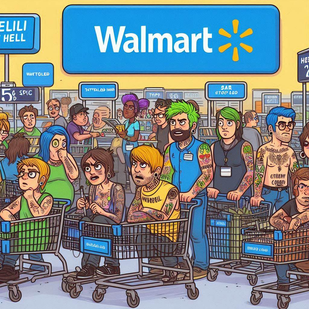 Have you ever noticed that Walmart has become the retail equivalent of Starbucks? It’s like all the people in the world who had their hair dyed to match what is in a box of crayons, who also had more tats than my brothers in a biker gang but who also failed their test on how to make a frappuccino at Starbucks all went to work at Walmart.